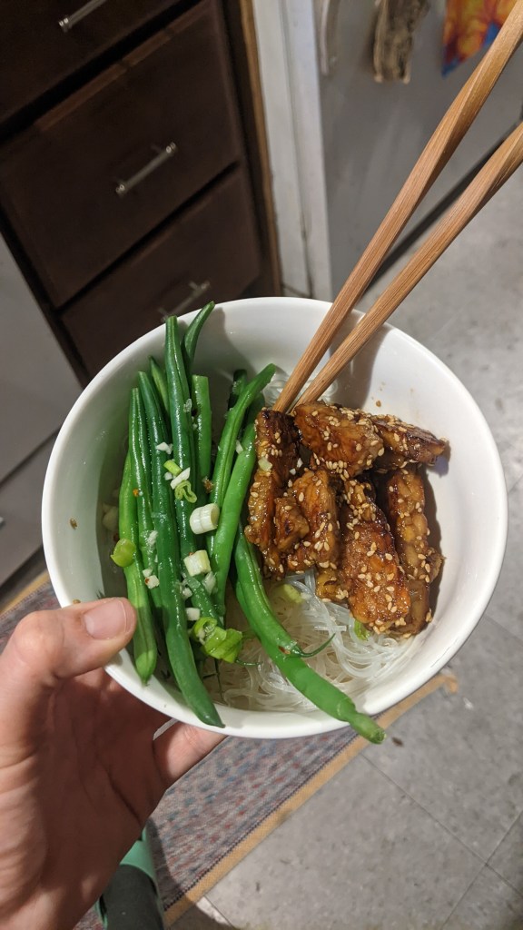This is the version she made herself to beckon me over the bowl she made me tho had like a vegan Mayo on it which I wouldn’t have thought of on my own but was so good with the bottom of whatever sauce she gave me and the rice noodles and all of it – I felt very lucky and grateful
